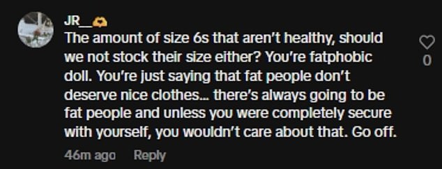‘The amount of size 6s that aren’t healthy, should we not stock their size either? You’re fatphobic doll,’ one person wrote.