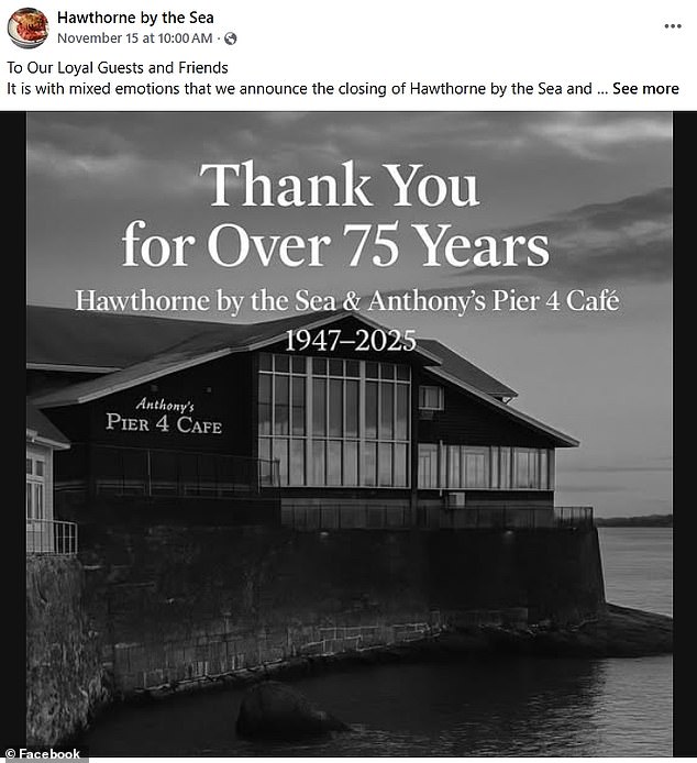 Hawthorne by the Sea announced this week that the seafood restaurant and its adjoining Anthony’s Pier 4 Cafe had officially closed after a 78-year stint at the Boston harbour.