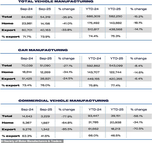 Just 51,090 vehicles left factory gates compared to 70,039 in September 2024 – down 19,000 units.