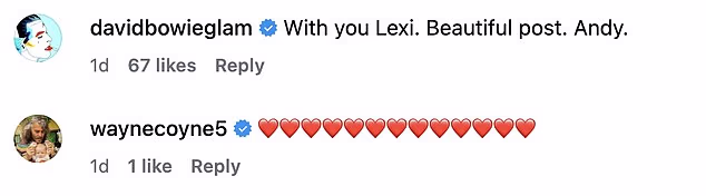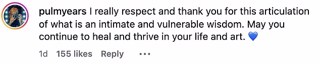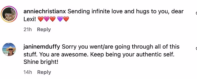 Meanwhile other followers wrote: ‘I really respect and thank you for this articulation of what is an intimate and vulnerable wisdom. May you continue to heal and thrive in your life and art’: ‘Sending infinite love and hugs to you, dear Lexi!’: ‘orry you went/are going through all of this stuff. You are awesome. Keep being your authentic self. Shine bright!’.