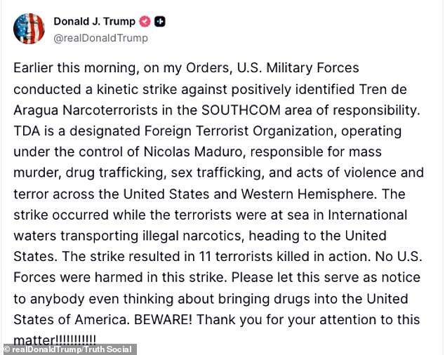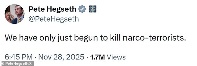 In a separate post shared on Friday evening, Hegseth warned: ‘We have only just begun to kill narco-terrorists.’