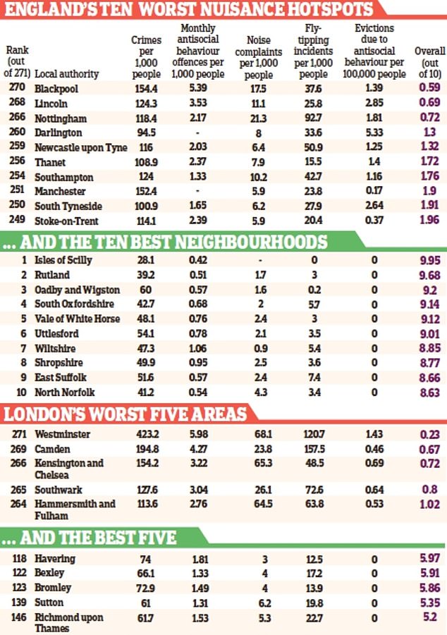 Check our table to see if yours is one of the best or worst areas for nuisance neighbours – or go to dailymail.co.uk/neighbours for the full interactive map of all areas in England.
