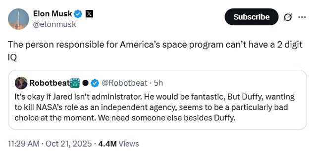 ‘The person responsible for America’s space program can’t have a two-digit IQ,’ Musk posted on X Tuesday afternoon, taking a shot at Duffy.