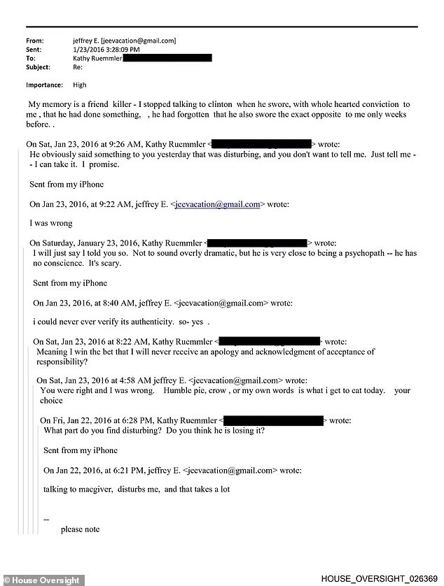 In a lengthy email thread discussing someone code named ‘McGyver’ who comes up elsewhere in their correspondence, Epstein joked that his ‘memory is a friend killer’ before discussing how Clinton had offended him.