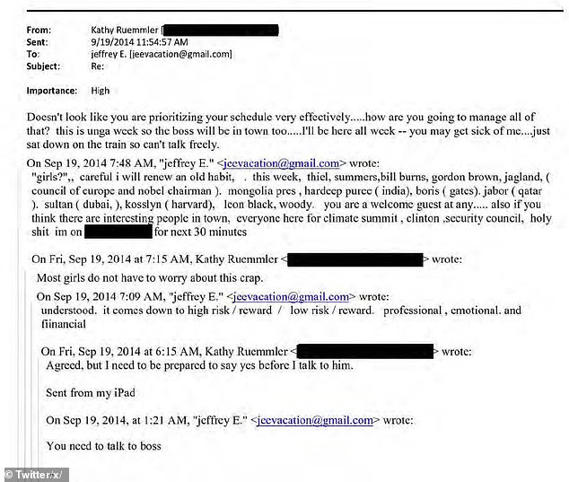 One of the emails between the two comes from September 19, 2014. Epstein wrote Ruemmler: ‘You need to talk to boss.’