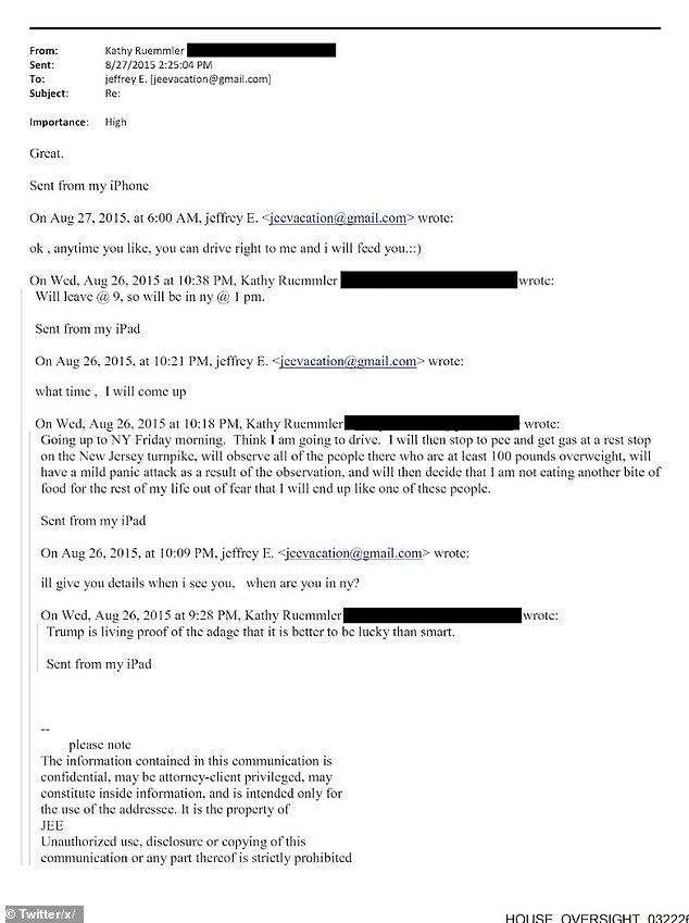 Ruemmler said that ‘the boss will be in town too’ and joked that Epstein ‘may get sick of me.’