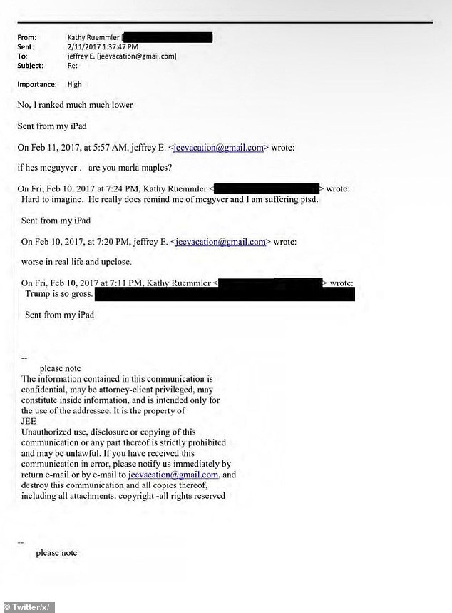 Several emails uncovered show Ruemmler and Epstein discussing their shared hatred of Donald Trump and at one point, Epstein invites her to his infamous New York City townhouse