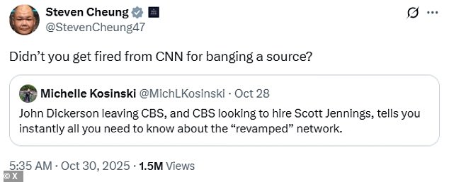The remarks from Steven Cheung came in response to a post from Michelle Kosinski criticizing recent changes at CBS News.