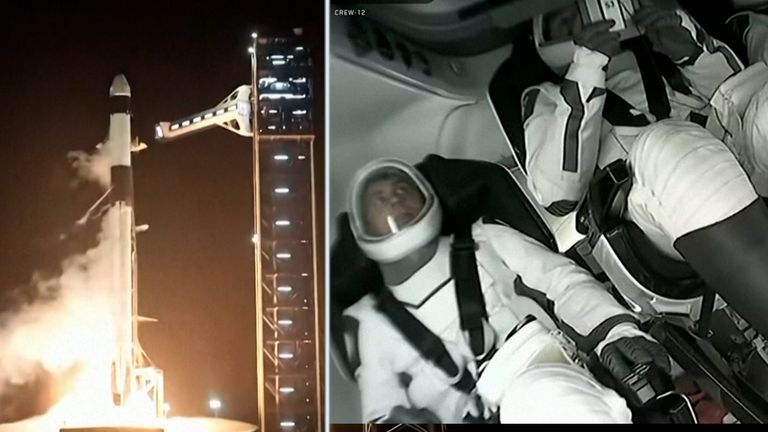 Video of the crew’s arrival shared by NASA shows the four newcomers floating through the hatch from the SpaceX Dragon spacecraft into the space station.