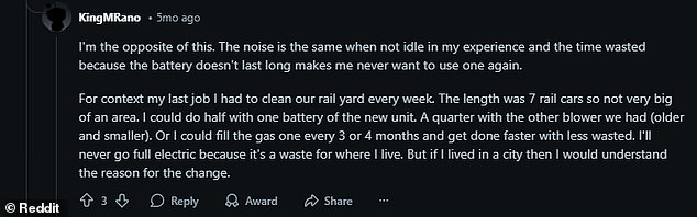 One Reddit user wrote: ‘This can’t happen fast enough. Not only is it way better for the environment, but electric ones are so much quieter! I am so annoyed by the sound of gas-powered lawn equipment by the end of the summer.’
