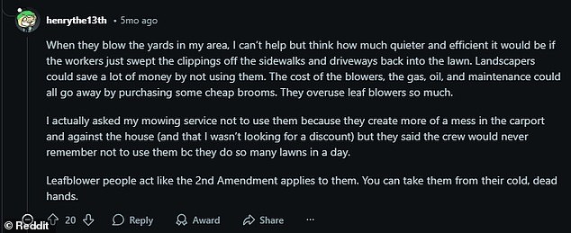 Others mocked the obsession with leaf blowers. ‘Leafblower people act like the 2nd Amendment applies to them. You can take them from their cold, dead hands,’ one commenter joked, while another added: ‘God forbid they remembered the existence of brooms and rakes.’