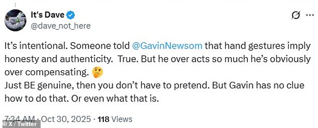 ‘Someone told @GavinNewsom that hand gestures imply honesty and authenticity. True. But he overacts so much he’s obviously overcompensating. Just BE genuine, then you don’t have to pretend. But Gavin has no clue how to do that. Or even what it is,’ one person wrote on X.