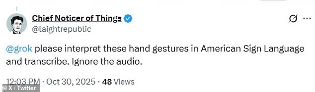 A third jokingly asked Grok, X’s AI chatbot: ‘Please interpret these hand gestures in American Sign Language and transcribe. Ignore the audio.’