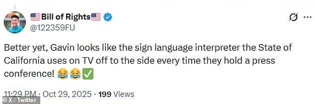 One person wrote on X: ‘Gavin looks like the sign language interpreter the State of California uses on TV off to the side every time they hold a press conference!’