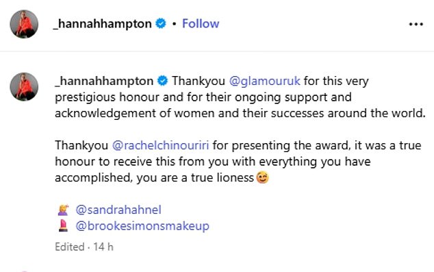 She wrote: ‘Thankyou @glamouruk for this very prestigious honour and for their ongoing support and acknowledgement of women and their successes around the world.