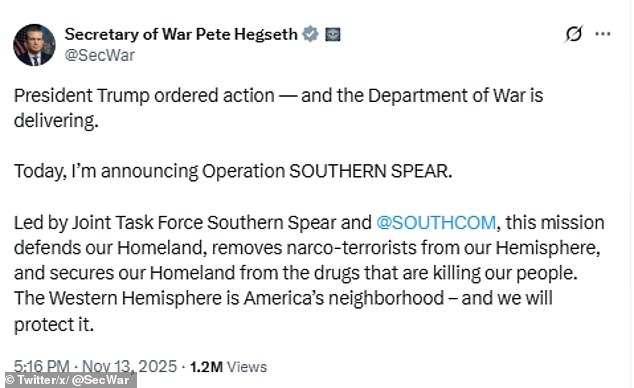 ‘President Trump ordered action — and the Department of War is delivering. Today, I’m announcing Operation SOUTHERN SPEAR,’ Hegseth wrote.