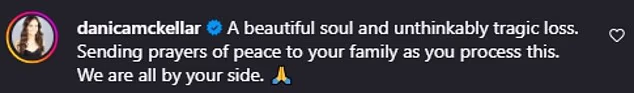 Hallmark star Danica McKellar penned, ‘A beautiful soul and unthinkably tragic loss. Sending prayers of peace to your family as you process this. We are all by your side.’