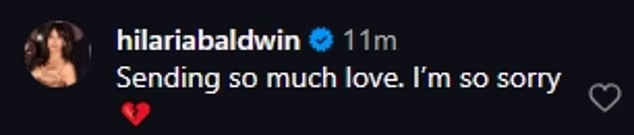 Hilaria Baldwin added, ‘Sending so much love. I’m so sorry.’