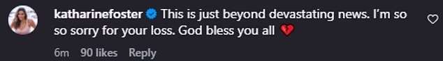 Singer Katharine McPhee and wife of David Foster wrote, ‘This is just beyond devastating news. I’m so so sorry for your loss. God bless you all.’