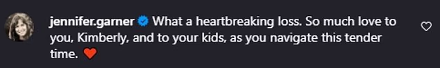 Garner Garner typed, 'What a heartbreaking loss. So much love to you, Kimberly, and to your kids, as you navigate this tender time. ♥️'
