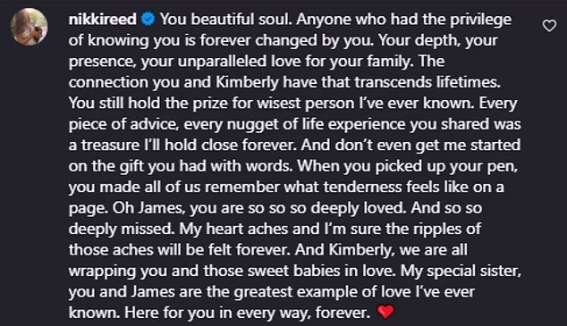 Reed additionally shared, ‘Oh James, you are so so so deeply loved. And so so deeply missed. My heart aches and I’m sure the ripples of those aches will be felt forever. And Kimberly, we are all wrapping you and those sweet babies in love.