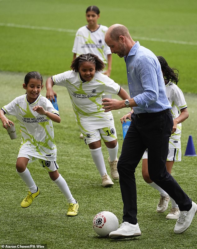 On the football pitch, the prince – sporting trendy white £179 sustainable trainers by Portuguese company Mr Marvis – and the former national defender played against each other in a three-a-side match testing the skills of the schoolboys from across Rio.