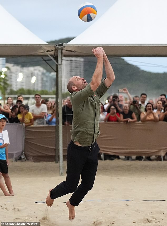 But this was not the royal’s only sporty engagement of the day as he was later seen barefoot while throwing himself around on the sands of Copacabana beach alongside Olympic star Carolina Solberg.