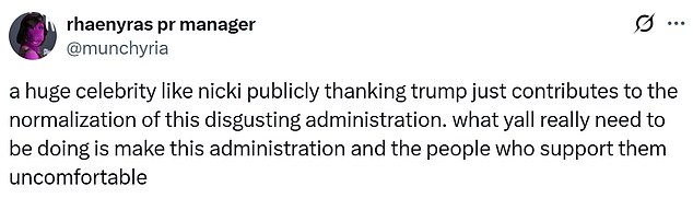 Another fumed: ‘a huge celebrity like nicki publicly thanking trump just contributes to the normalization of this disgusting administration. what yall really need to be doing is make this administration and the people who support them uncomfortable.’