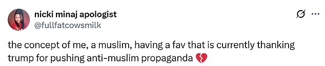 An X user called ‘nicki minaj apologist’ bewailed ‘the concept of me, a muslim, having a fav that is currently thanking trump for pushing anti-muslim propaganda.’