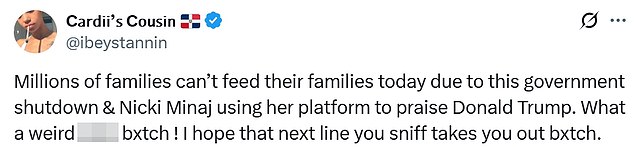 Liberal fans reacted with apoplexy, including one who tweeted: ‘Millions of families can’t feed their families today due to this government shutdown & Nicki Minaj using her platform to praise Donald Trump. What a weird a** bxtch ! I hope that next line you sniff takes you out bxtch.’
