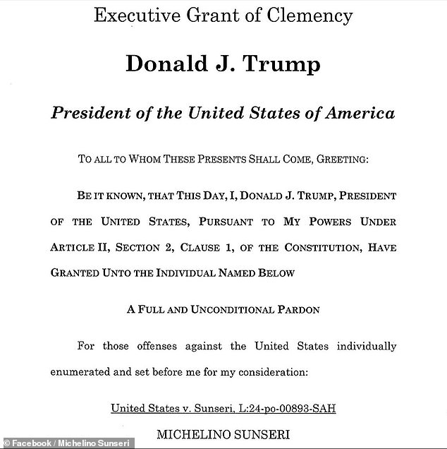 Michelino Sunseri, 33, told the Daily Mail that he was still surprised at the presidential pardon signed by Donald Trump last Friday