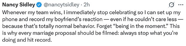 A fourth sarcastically added: ‘Whenever my team wins, I immediately stop celebrating so I can set up my phone and record my boyfriend’s reaction – even if he couldn’t care less – because that’s totally normal behavior.