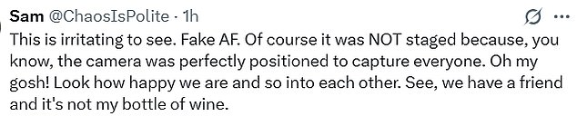 ‘This is irritating to see. Fake AF. Of course it was NOT staged because, you know, the camera was perfectly positioned to capture everyone,’ one person quipped.