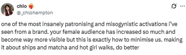 ‘Your female audience has increased so much and become way more visible but this is exactly how to minimise us. Making it about ships and matcha and hot girl walks, do better.’