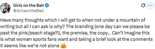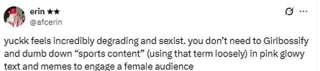 ‘Yuckk feels incredibly degrading and sexist,’ one person wrote on X. ‘You don’t need to Girlbossify and dumb down “sports content” (using that term loosely) in pink glowy text and memes to engage a female audience.’