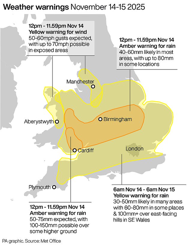 Two 12-hour ‘danger to life’ amber warnings for up to six inches (150mm) of rain have been imposed for parts of central England and South Wales, from noon until midnight.