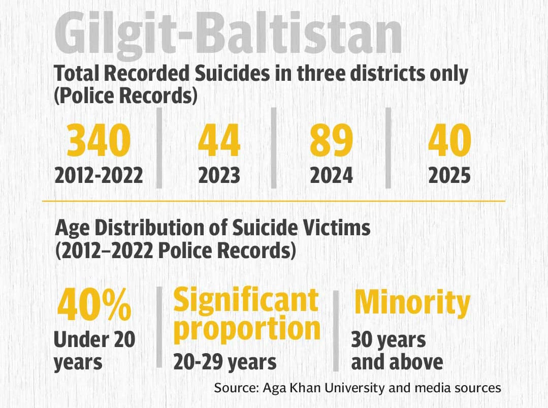 According to some estimates, at least one person takes their life each minute in the country. As per a study by Aga Khan University (AKU), police-record data from three districts in Gilgit-Baltistan show 340 suicides between 2012 and 2022, with 40% of victims under age 20. Even these numbers, Mashhood contested, are highly underreported.