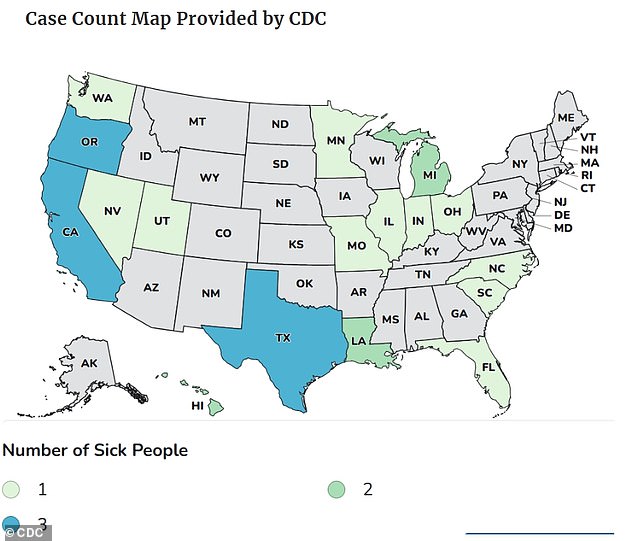 States that have reported sicknesses are: California, Florida, Hawaii, Illinois, Indiana, Louisiana, Michigan, Minnesota, Missouri, North Carolina, Nevada, Ohio, Oregon, South Carolina, Texas, Utah, Virginia and Washington.