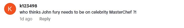 ‘Who thinks John fury needs to be on Celebrity MasterChef?!,’ wrote one account, while another put: ‘Celebrity MasterChef will be calling soon… Enjoy lad.’