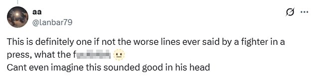Another confused fan said: ‘This is definitely one if not the worse lines ever said by a fighter in a press, what the f***. Cant even imagine this sounded good in his head’.