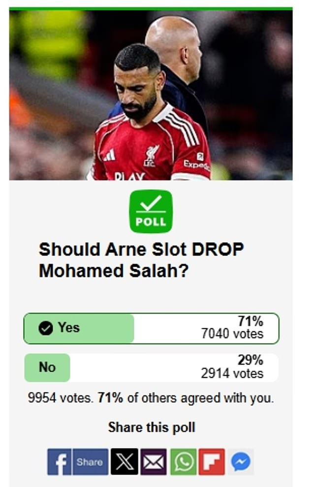 And Daily Mail Sport readers agree with Carragher, with 71 per cent of readers believing Salah should be dropped by Slot.